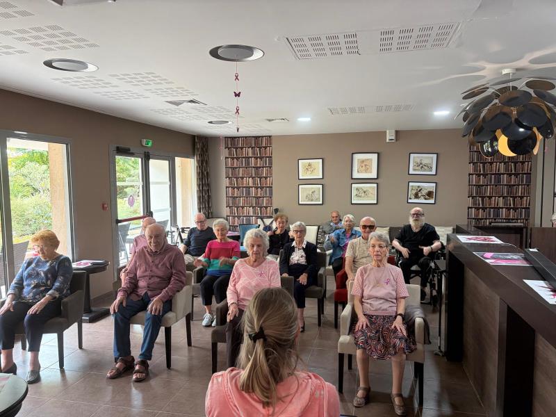 Résidents, personnel et même les murs de la résidence ont joué le jeu : tous étaient habillés en rose pour marquer leur soutien à cette cause importante. La journée a débuté par un apéritif festif accompagné de délicieux petits-fours, suivi d’un déjeuner décoré avec soin, dans une ambiance chaleureuse et colorée.